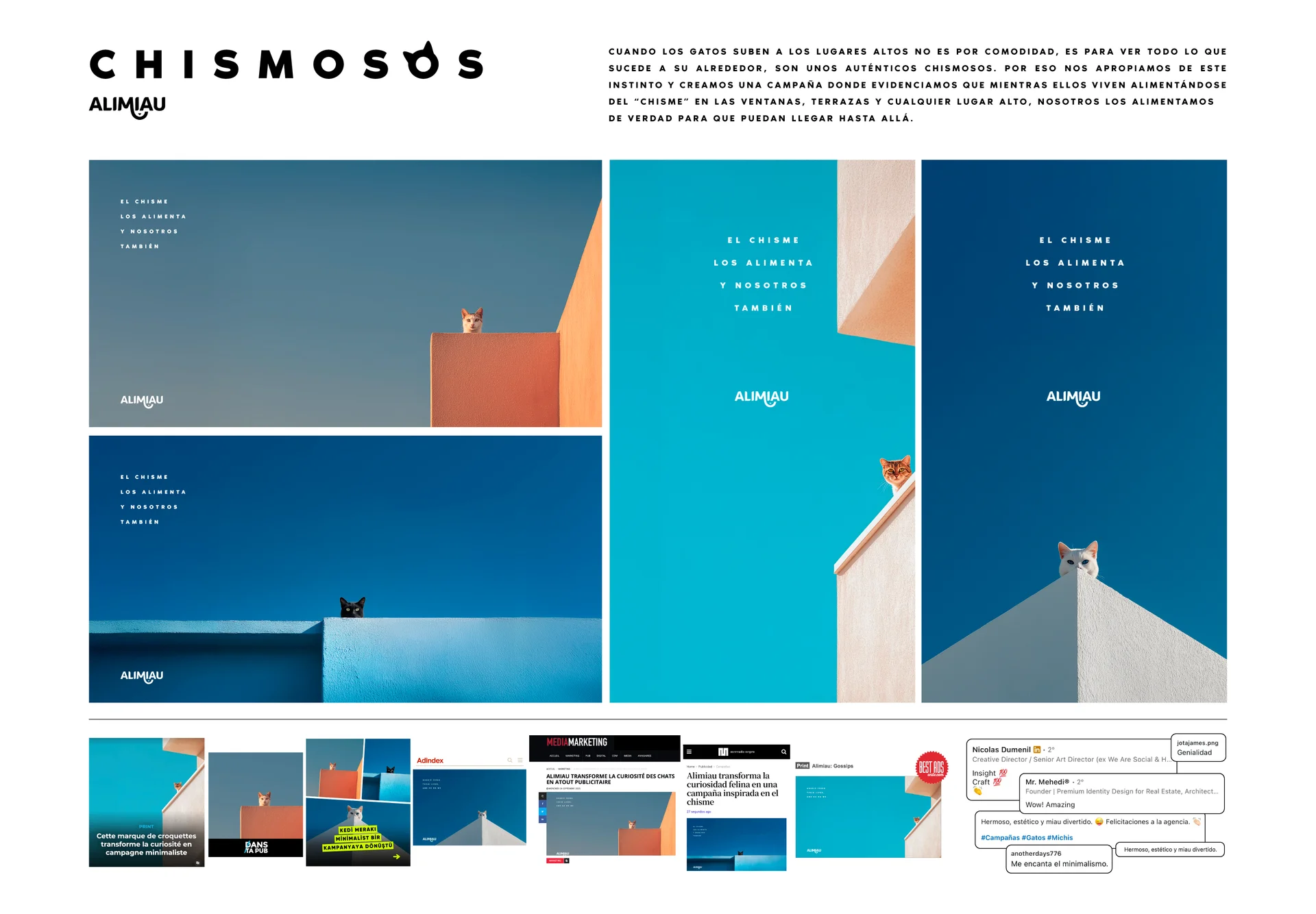 Creamos Chismosos para ALIMIAU a partir de un insight simple y reconocible: cuando los gatos se suben a lugares altos, no es por comodidad, sino para observar todo lo que sucede a su alrededor. Nos apropiamos de ese comportamiento y del concepto de “chisme” para construir una idea clara y visual. Mientras ellos pasan el día mirando desde ventanas, terrazas y alturas imposibles, nosotros los alimentamos para que puedan seguir ahí, siendo los verdaderos chismosos. A través de una ejecución minimalista y composiciones limpias, posicionamos a ALIMIAU como la marca que alimenta su curiosidad… y su chisme.